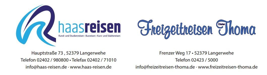 Stornobedingungen bei unseren Tagesfahrten: Bei Absage bis 5 Tage vor Abreise erheben wir 5,- € Bearbeitungsgebühr pro Person, ab 4 Tage vor Reisebeginn 90 % Stornokosten, bei Absage am Abfahrtstag oder Nichterscheinen sind 100 % fällig.